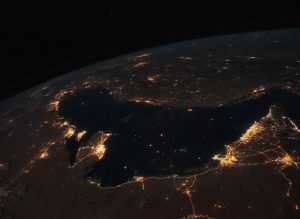 The lights speckled across the dark waters of the Gulf indicate ships passing through one of the world’s major trade routes. The narrowest section is the Strait of Hormuz, which connects the Persian Gulf to the Gulf of Oman. The Strait varies in width between 39 and 96 kilometers (21 to 90 nautical miles) and represents an important chokepoint in the global trade network that funnels millions of barrels of crude oil and petroleum products per day through the region.
