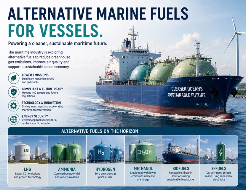 Alternative marine fuels are fuels used to reduce reliance on conventional fossil marine fuels. They include LNG, methanol, ammonia, hydrogen, biofuels, and synthetic fuels.