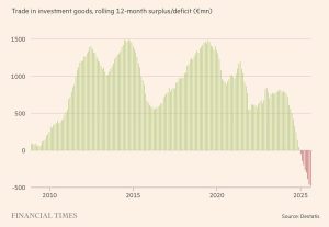 For Germany, a newly circulating chart—originally shared by major financial outlets and based on Destatis, Germany’s federal statistics office—shows a dramatic economic shift: Germany’s rolling 12-month trade balance in investment goods has fallen sharply, moving from years of strong surplus into a steep deficit by 2024–2025. For a country long considered Europe’s industrial engine, this reversal is not just a cyclical fluctuation; it raises structural questions about competitiveness, supply chains, Chinese industrial capacity, and global manufacturing realignment.