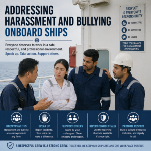Harassment and bullying onboard ships include verbal abuse, intimidation, discrimination, sexual harassment, exclusion, and abuse of authority that undermine a seafarer’s dignity, safety, and mental wellbeing. These behaviors are especially serious at sea because ships are isolated, hierarchical workplaces where victims may find it difficult to report abuse or escape it. From 1 January 2026, updated IMO STCW requirements include mandatory training on preventing violence and harassment, reflecting the growing recognition that respectful shipboard culture is essential for both crew welfare and maritime safety.